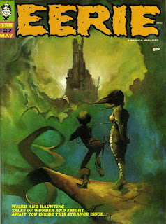 Per fortuna in quell'anno succede anche altro. Per esempio che James Warren, che ha fatto spesso capolino in questa serie di post, riprenda le redini della casa editrice da lui fondata, la Warren Publishing, nel tentativo di risollevarne le sorti. La sua felice intuizione è che nel 1969 i tempi siano ormai maturi per dare spazio a una testata horror al femminile da affiancare a Creepy e Eerie. Nasce così Vampirella, il cui esordio è contrassegnato da una copertina (qui a lato) di Frank Frazetta (1928-2010) destinata a diventare una vera e propria icona dell'illustrazione fantastica.